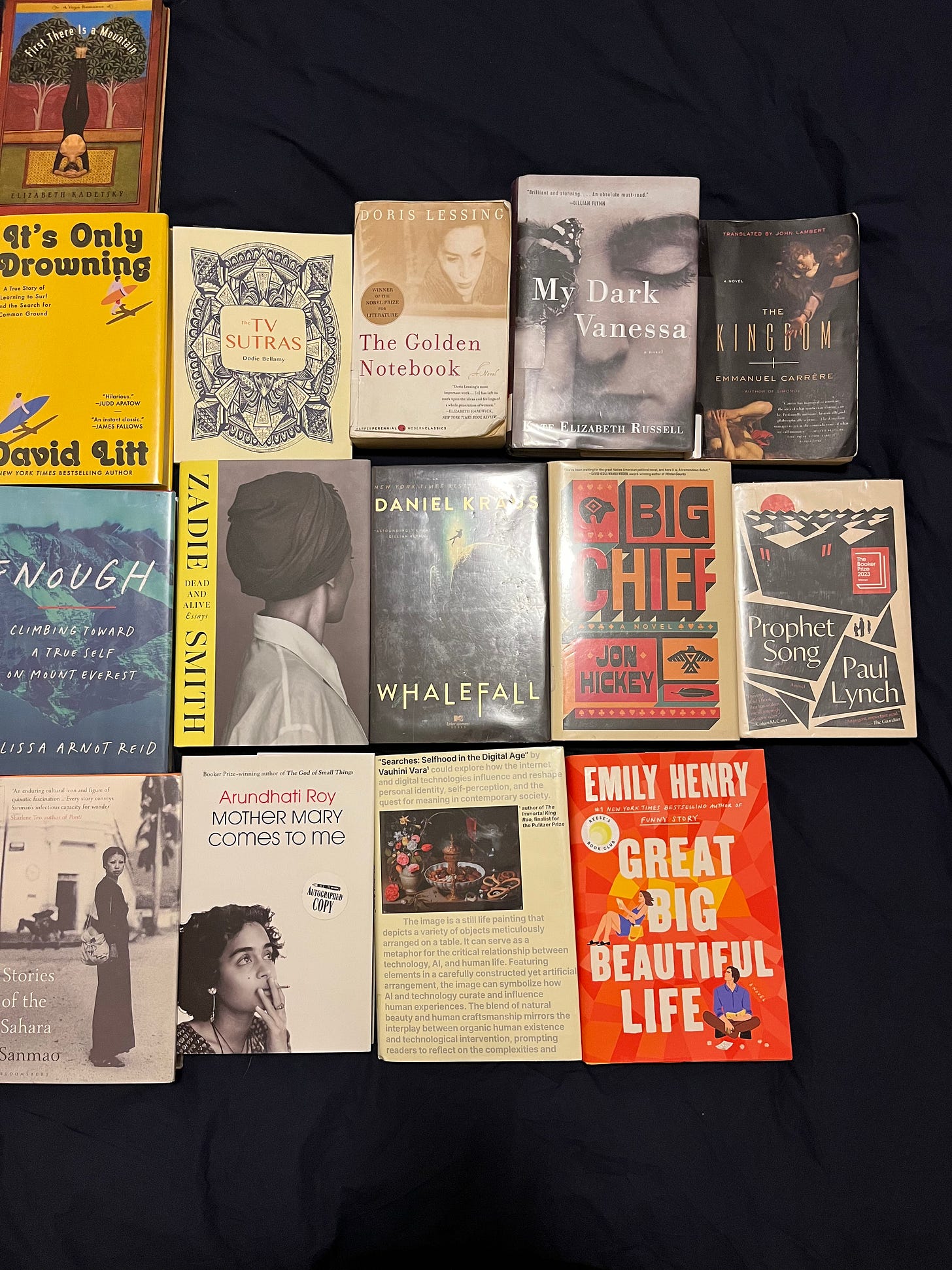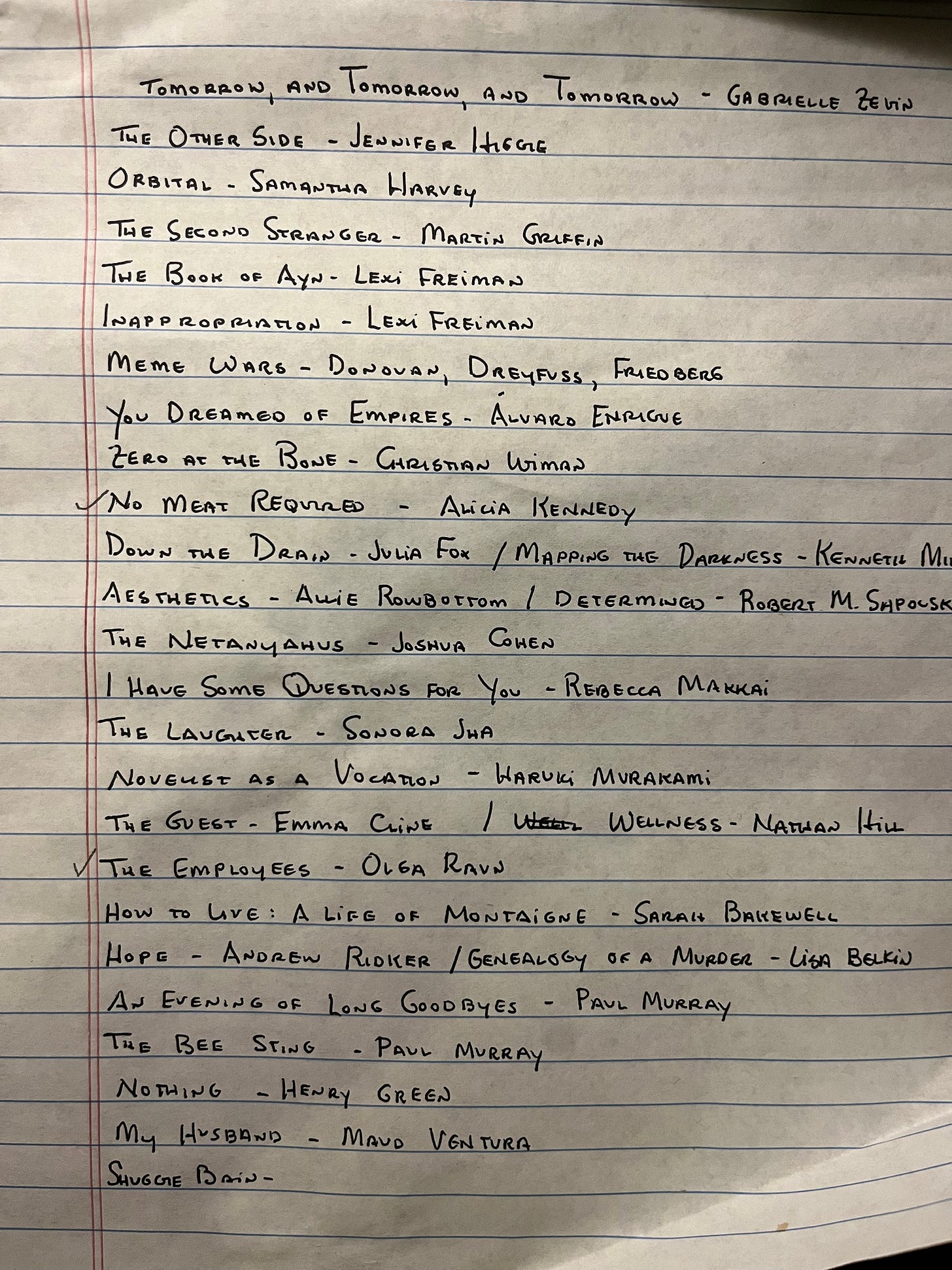 This count includes two books that I read more than halfway and then abandoned (Doppelganger: A Trip into the Mirror World by Naomi Klein and Death Takes Me by Cristina Rivera Garza), four that I have been reading at a pleasurably glacial pace (The Broken King by Michael Thomas, Ruth by Kate Riley, The Heart of Practice by Orit Sen-Gupta, The Evening and the Morning by Ken Follett), and two that I recently began and expect to finish by year’s end (Searches: Selfhood in the Digital Age by Vauhini Vara and A Truce That Is Not Peace by Miriam Toews).
